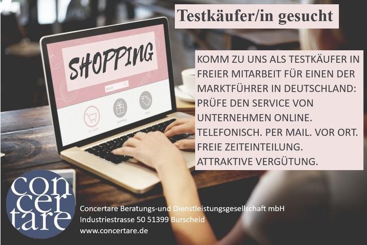 Verdienen Sie Ihr Geld beim Einkaufen. Marktforschungsunternehmen concertare sucht Servicetester im Automobilbereich. Freie Zeiteinteilung und guter Nebenverdienst. Ein Gewerbeschein ist nicht erforderlich.Bitte tragen Sie sich bei Interesse und für weitere Informationen kostenlos und unverbindlich unter folgendem Link in unsere Datenbank ein: